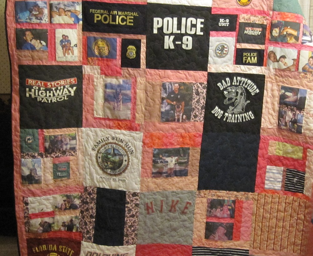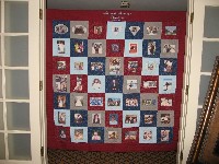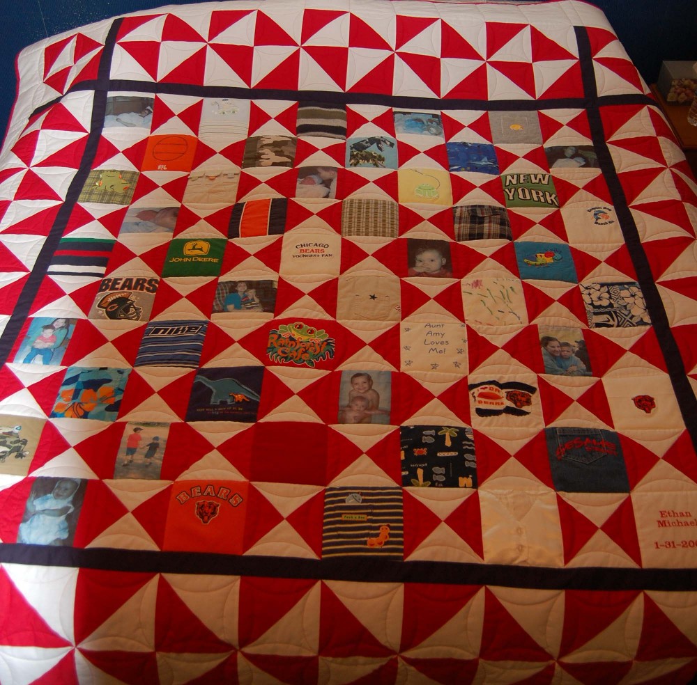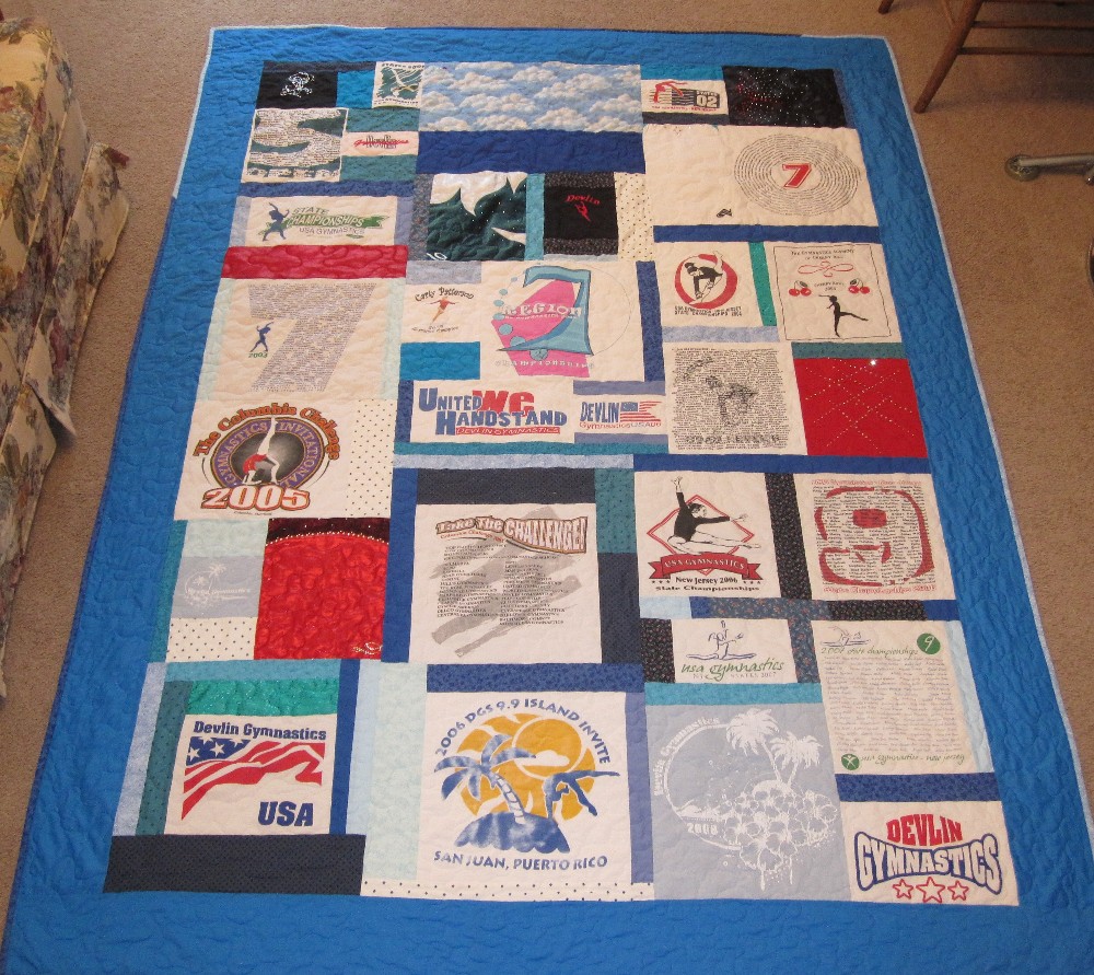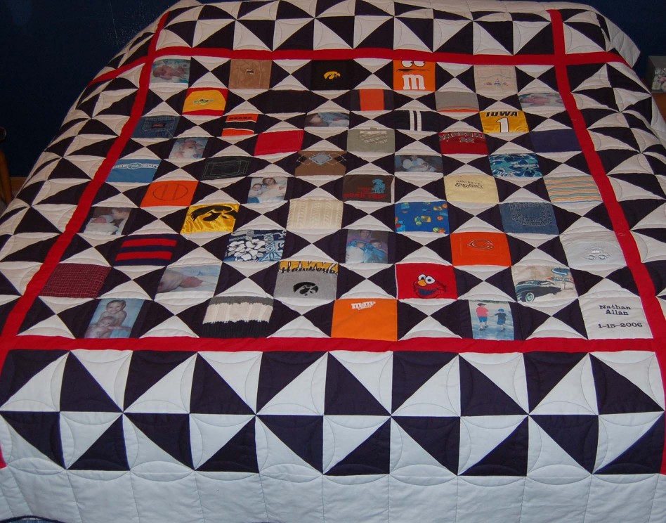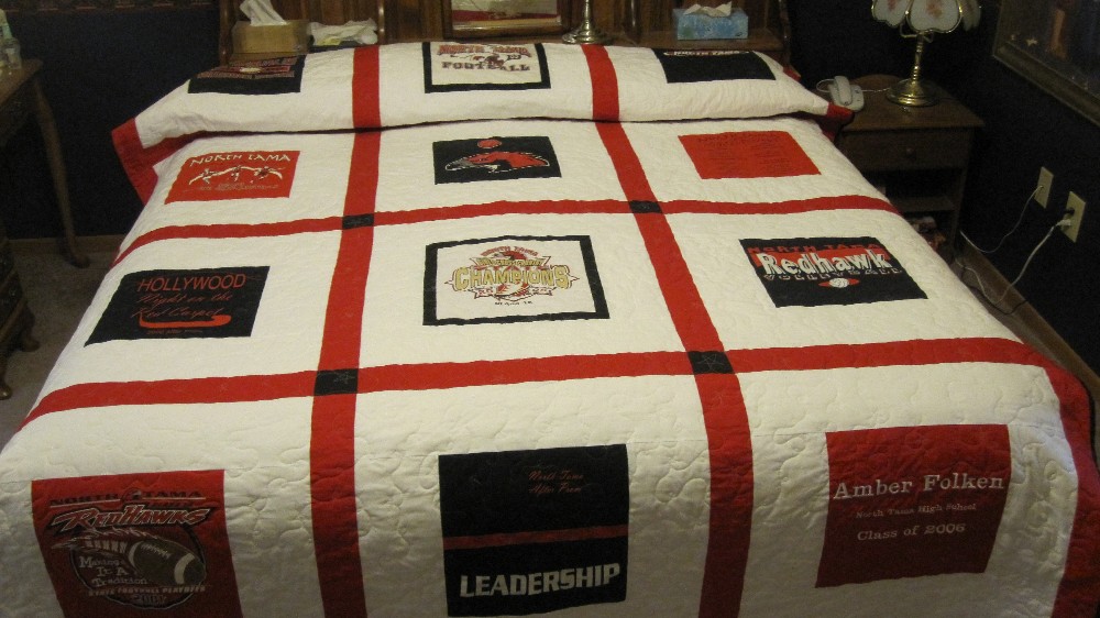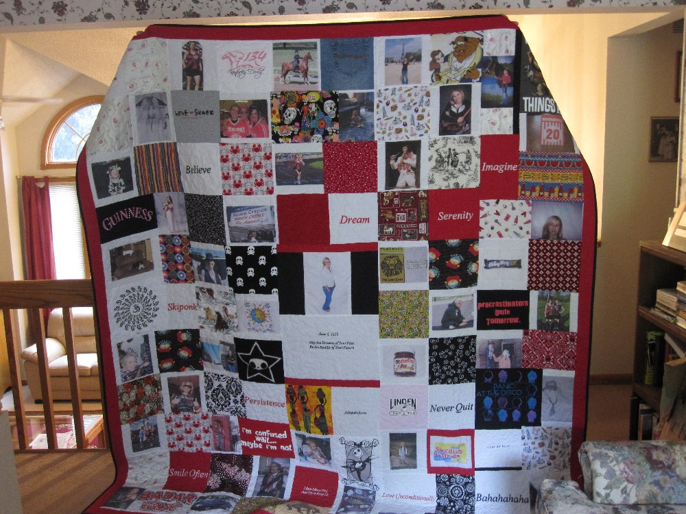 A queen sized quilt could be made from a small number of t-shirts by adding more fabric around them. An embroidered block was added to personalize it.