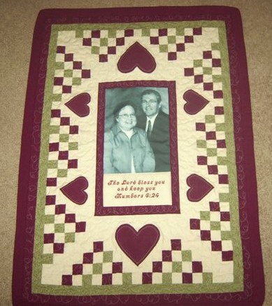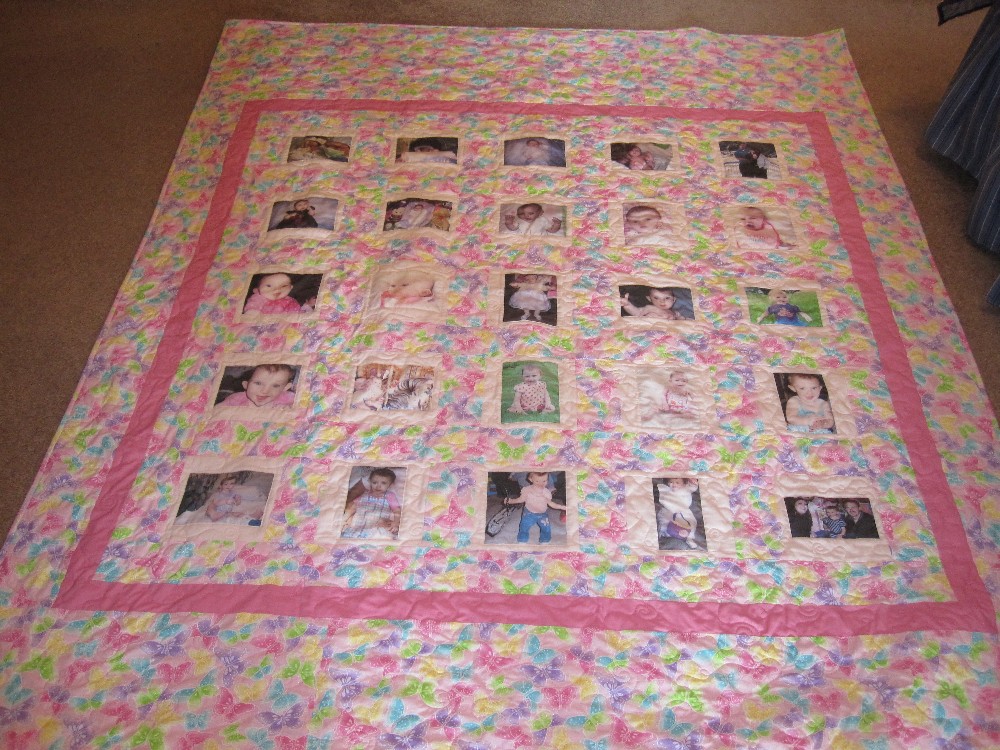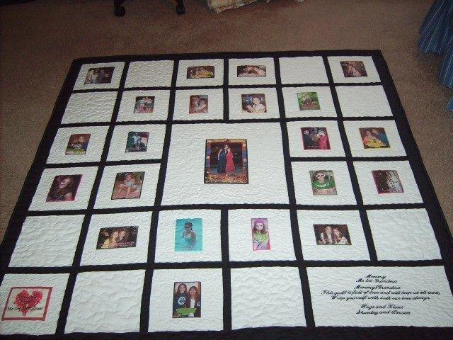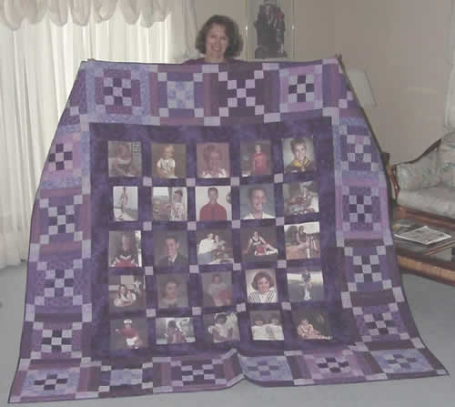 A lucky mom can keep warm in memories with this lap sized quilt exhibiting pictures of her daughter and granddaughter.