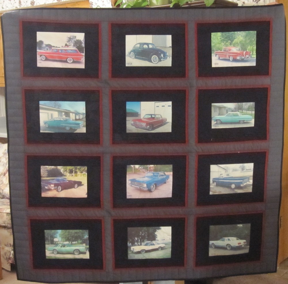 This 60 x 60 wall hanging was made with photographs of automobiles that a car enthusiast restored.